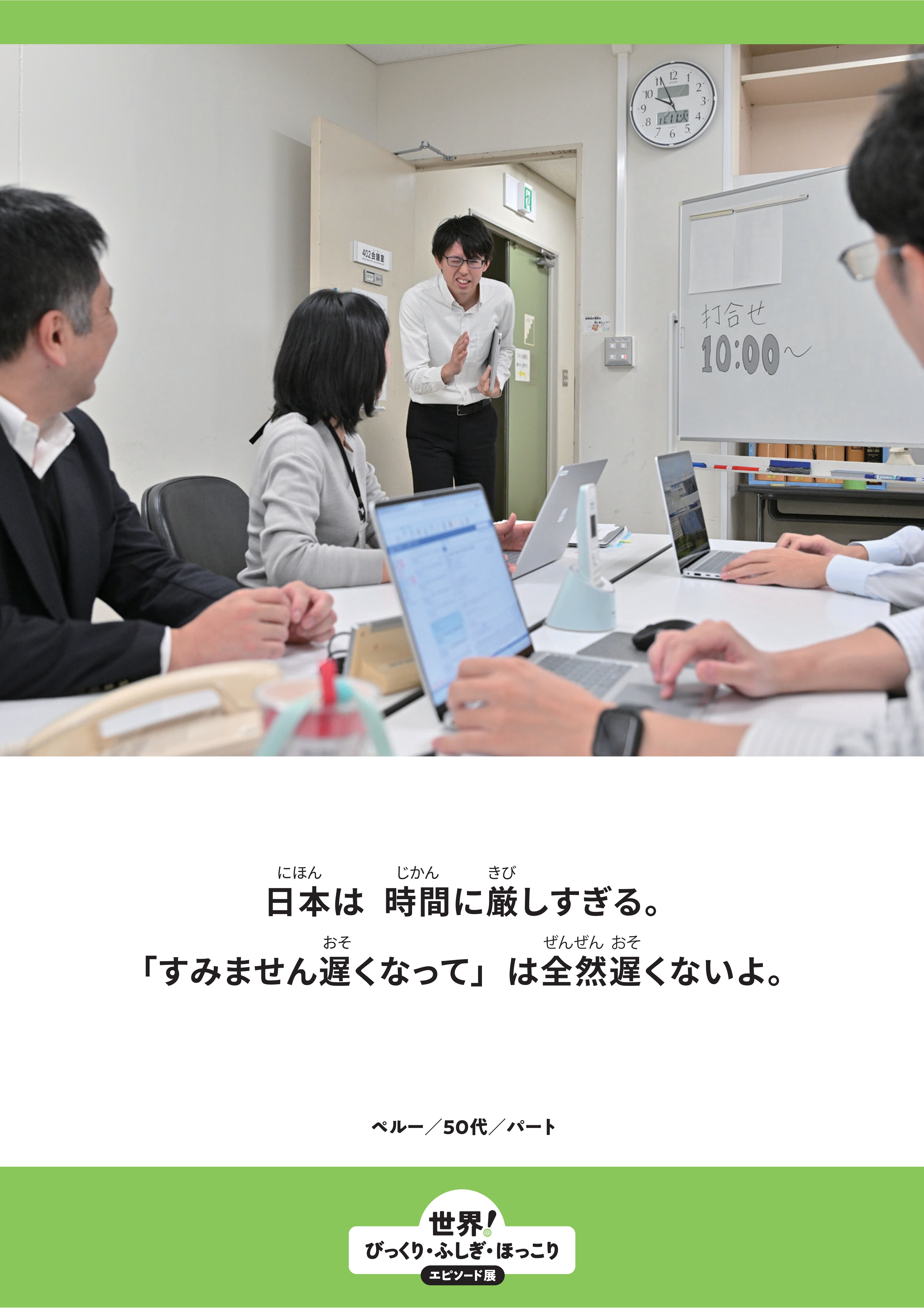 日本人と外国人によるワークショップや、市内の外国人雇用企業、日本語学校、高校などに通う従業員や学生から700点以上寄せられたエピソードから、日本人・外国人の市民代表者10人が展示する75点を選定しました。
