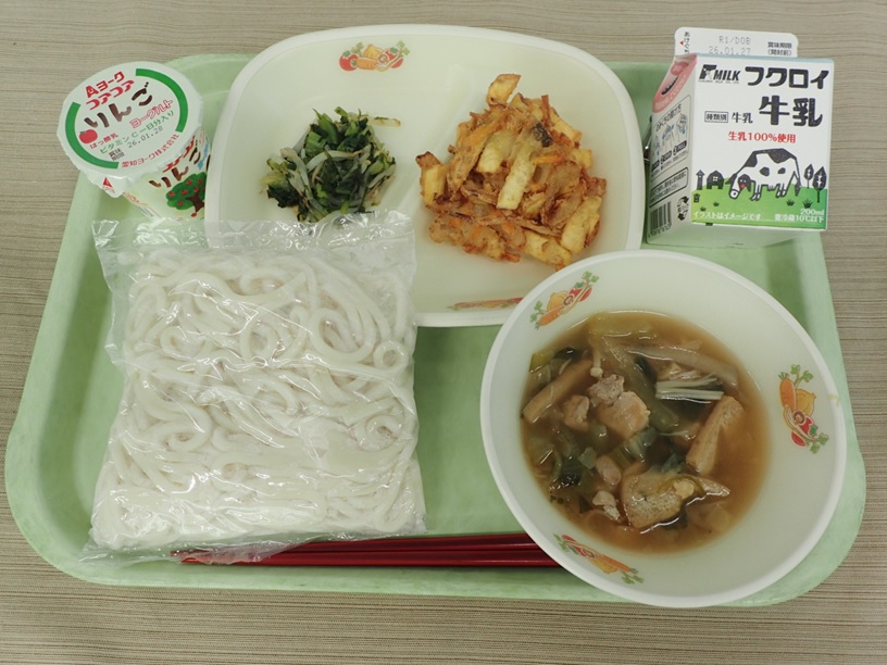 やさいのいそかあえ、ごもくうどんのしる、りんごヨーグルト