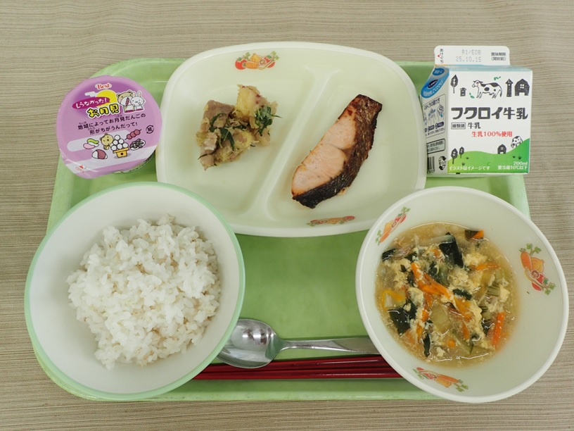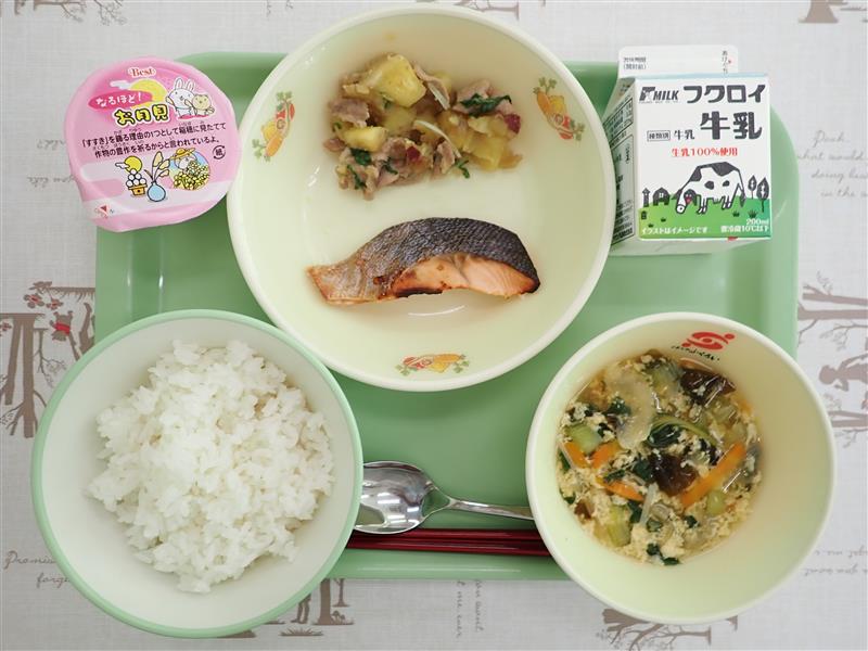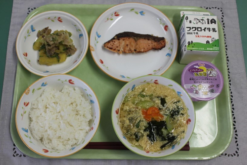ごはん、ぎゅうにゅう、さけのしおこうじやき、
