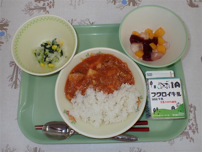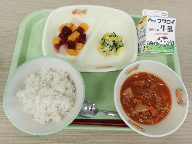 ごはん、ぎゅうにゅう、ハッシュドポーク、