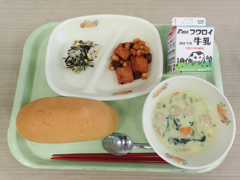 げんまいロールパン、ぎゅうにゅう、だいずとあつあげのケチャップあえ、