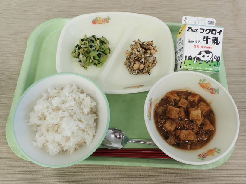 むぎごはん、ぎゅうにゅう、あつあげコロコロマーボー、