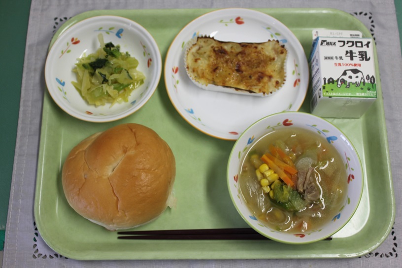 りんごチップパン、ぎゅうにゅう、ポテトグラタン、