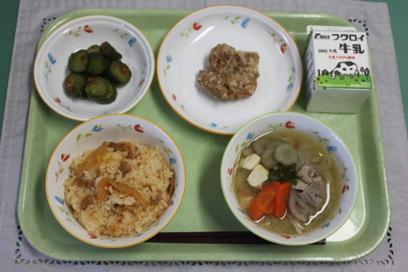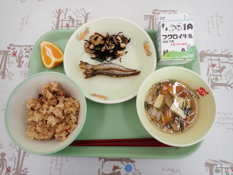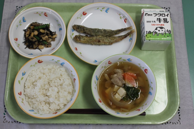 ごもくごはん(アルファかまい)、ぎゅうにゅう、ししゃものあおのりあげ、
