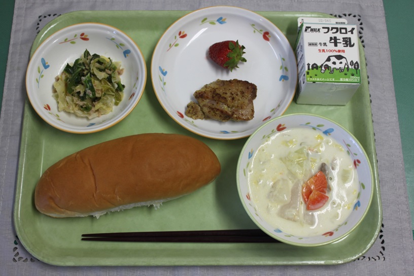 キャベツとケールのソテー、ふゆやさいたっぷりチャウダー、いちご