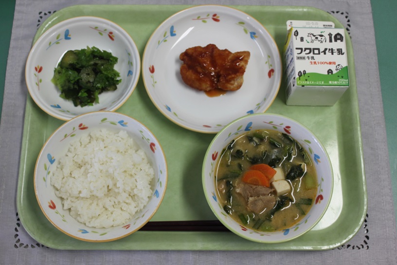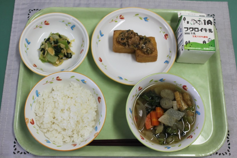 ごはん、ぎゅうにゅう、あつあげのにくみそがけ、