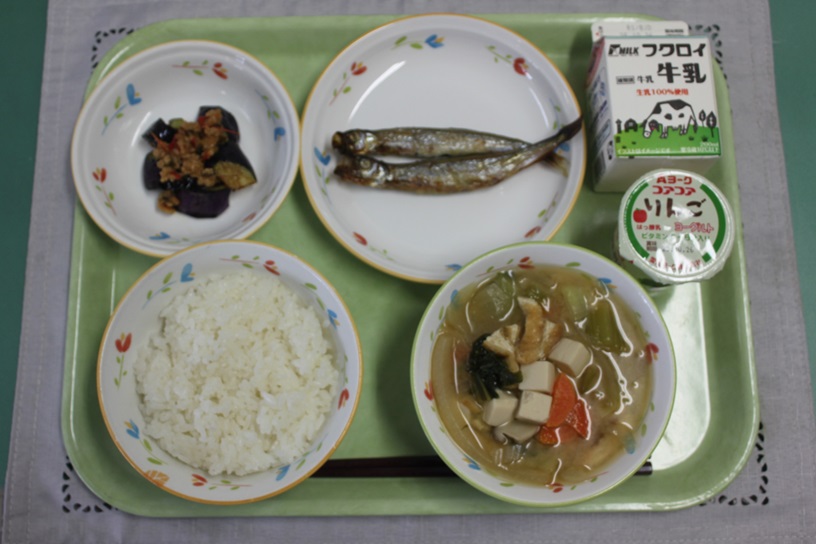 あきなすのそぼろあん、とうふのみそしる、りんごヨーグルト