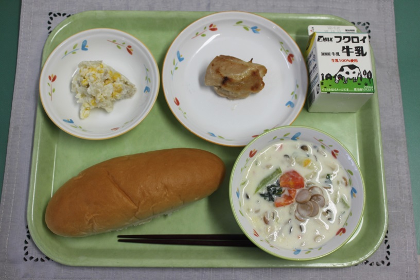 ロールパン、ぎゅうにゅう、ガーリックレモンチキン、