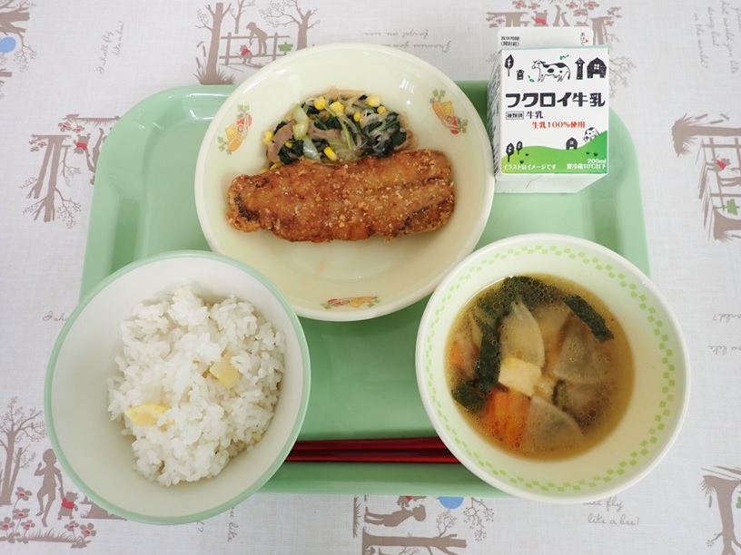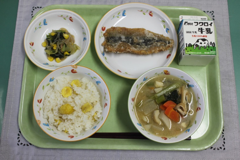 くりごはん、ぎゅうにゅう、さんまのたつたあげ、
