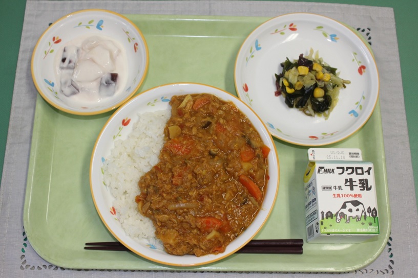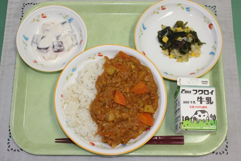 むぎごはん、ぎゅうにゅう、あきのみかくカレー、