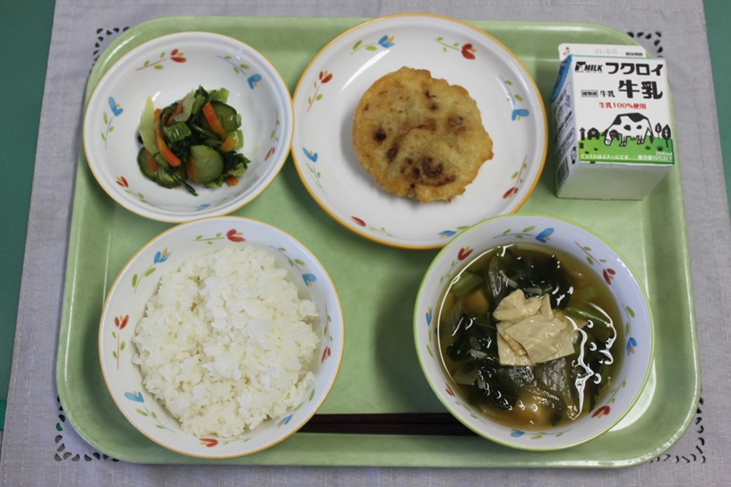 ごはん、ぎゅうにゅう、れんこんのはさみあげ、
