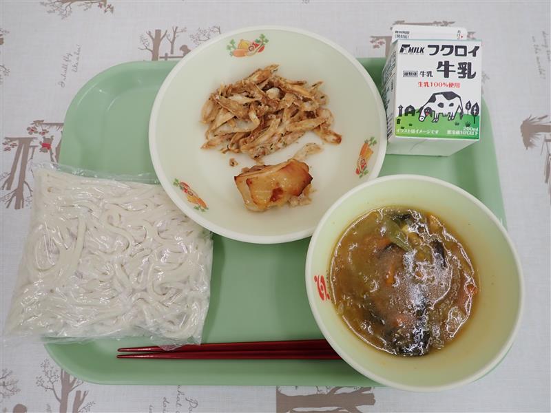 うどん、ぎゅうにゅう、とりにくのてりやき、