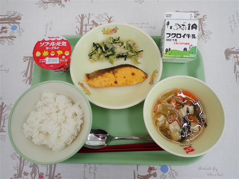 ごはん、ぎゅうにゅう、さけのもみじやき、