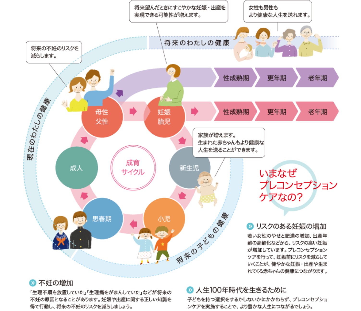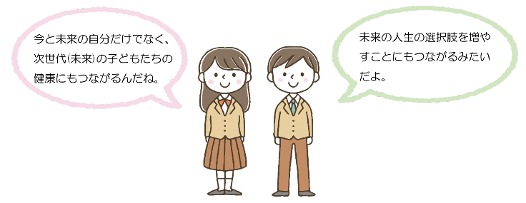 プレコンセプションケア(通称「プレコン」)とは、「性別を問わず、適切な時期に、性や健康に関する正しい知識を持ち、妊娠・出産を含めたライフデザイン(将来設計)や将来の健康を考えて健康管理を行う取組」のことを言います。将来の妊娠を希望する人もしない人も、男性も女性も、今できることから始めてみましょう!