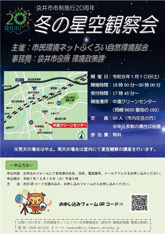 市民環境ネットふくろい・自然環境部会では、星空の観察という身近な方法により、大気環境の重要性について考えていただくことを目的に、市内在住の方を対象に冬の星空観察会を開催します。