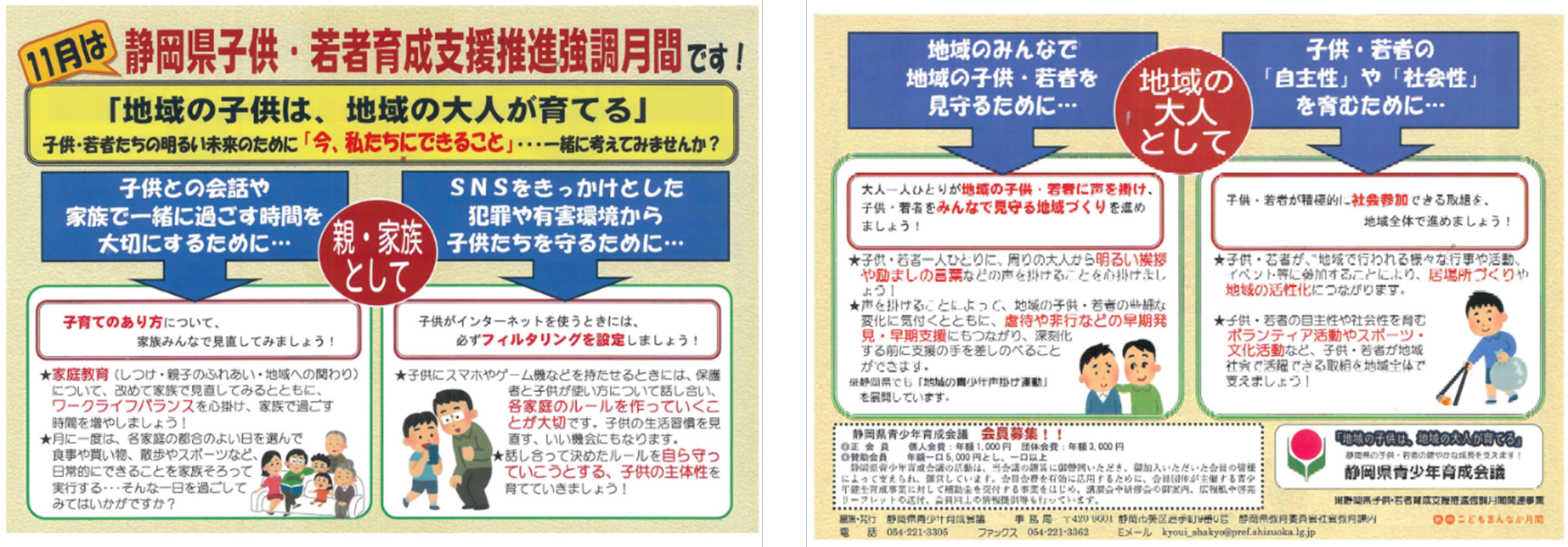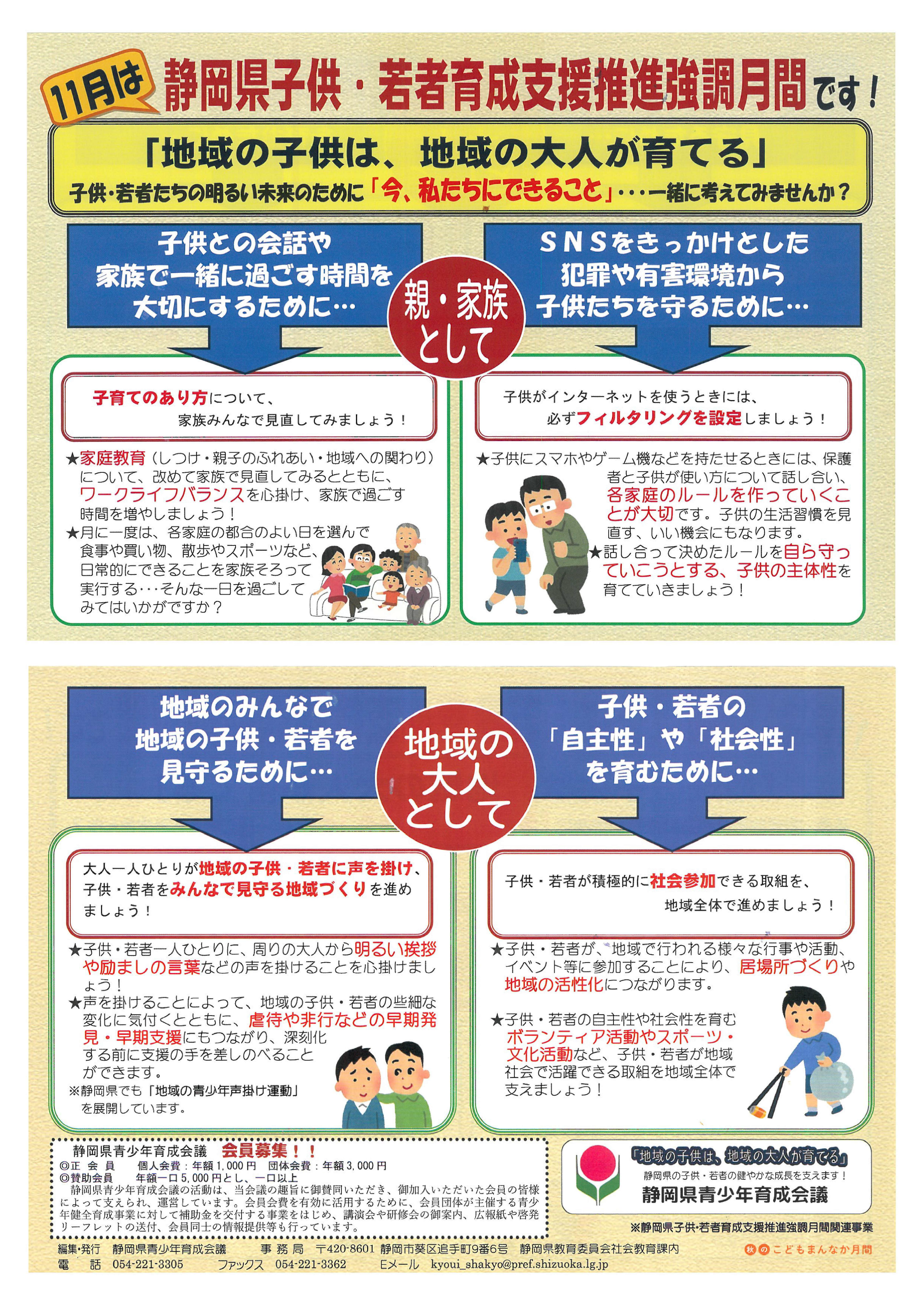 静岡県では、子供・若者を見守り育てるという地域づくりや、子供・若者の地域社会参加・参画活動の推進など、親子のふれあいや家族のあり方についての話し合いなど、県民それぞれが子供や若者の健全育成について積極的に考え、行動するきっかけとなるよう11月を強調月間に定めています。