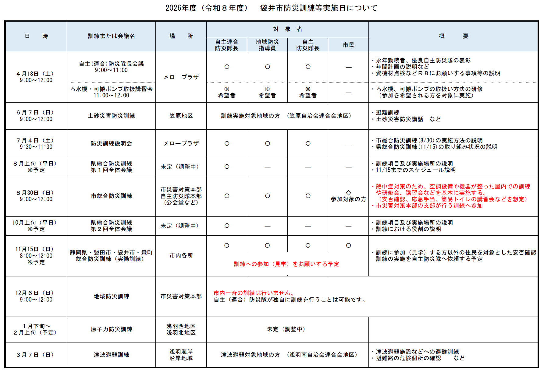 令和8年度 袋井市防災訓練等実施日