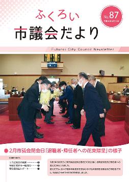 表紙:2月市議会閉会日「退職者・帰任者への花束贈呈」の様子 |