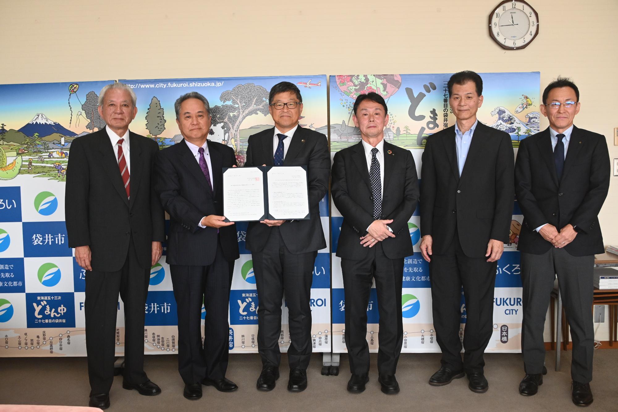 左から寒竹副会長、鈴木会長、大場市長、内野委員、大河原副市長、石田副市長