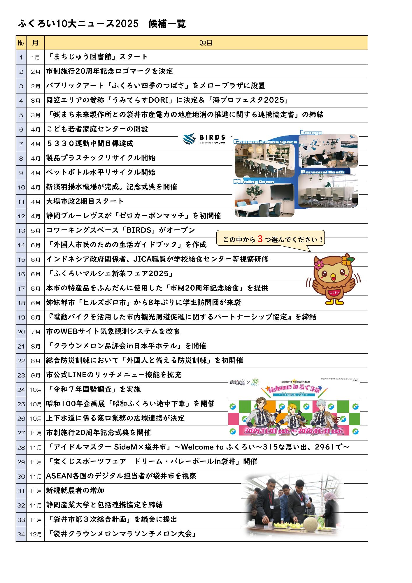 市で選定した「ふくろい10大ニュース2025 候補一覧」の中から、印象に残っているもの、関心のあるものなどを、3項目選んでください。※投票は1人1回まででお願いします。