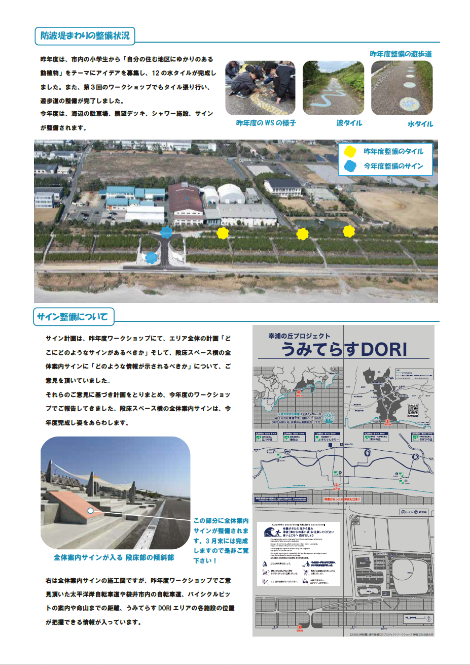 浅羽海岸において、津波の被害から命や家、田畑を守るために進めている防潮堤の整備とともに、利活用について検討するため、地元の自治会や祭り青年、子ども会、サーフィン団体などの各団体の方々が参加するワークショップを平成29年度から開催しています。