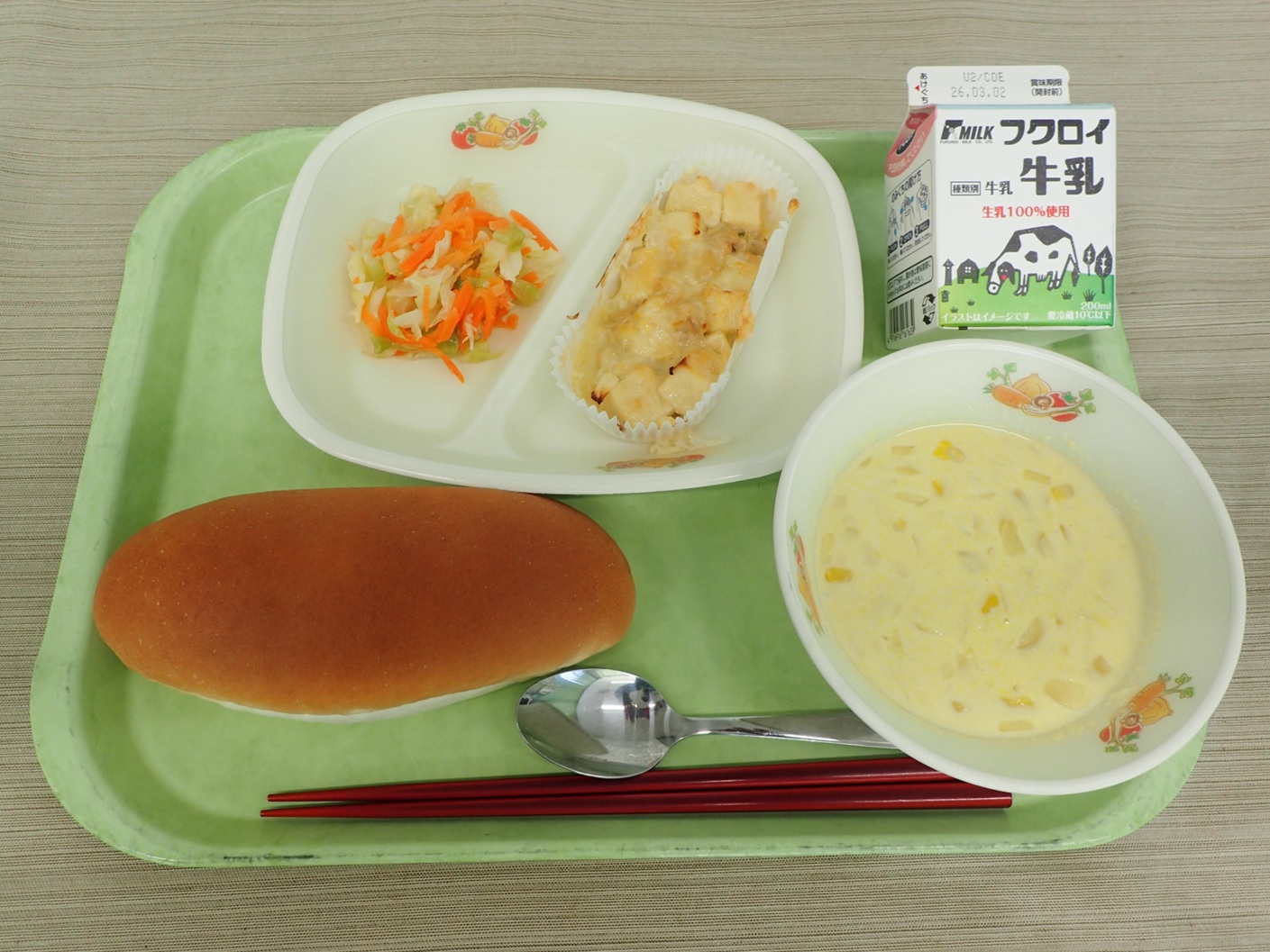 ロールパン、ぎゅうにゅう、こうやどうふのチーズやき、