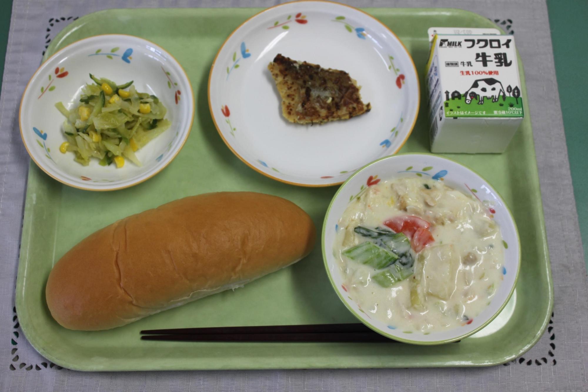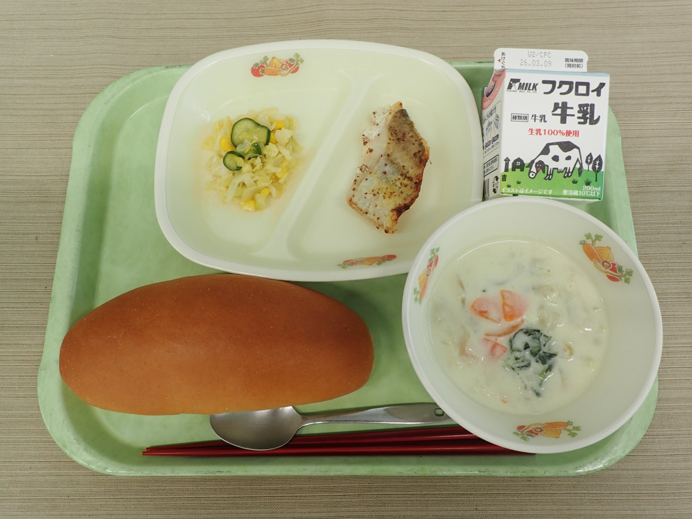 ロールパン、ぎゅうにゅう、たらのマスタードやき、