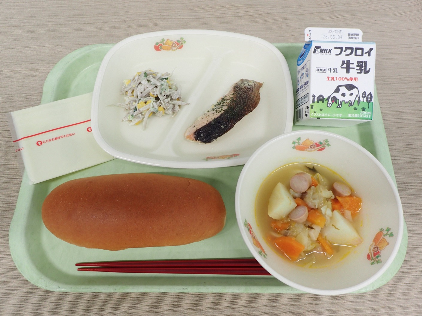 ロールパン、ぎゅうにゅう、さけのガーリックやき、