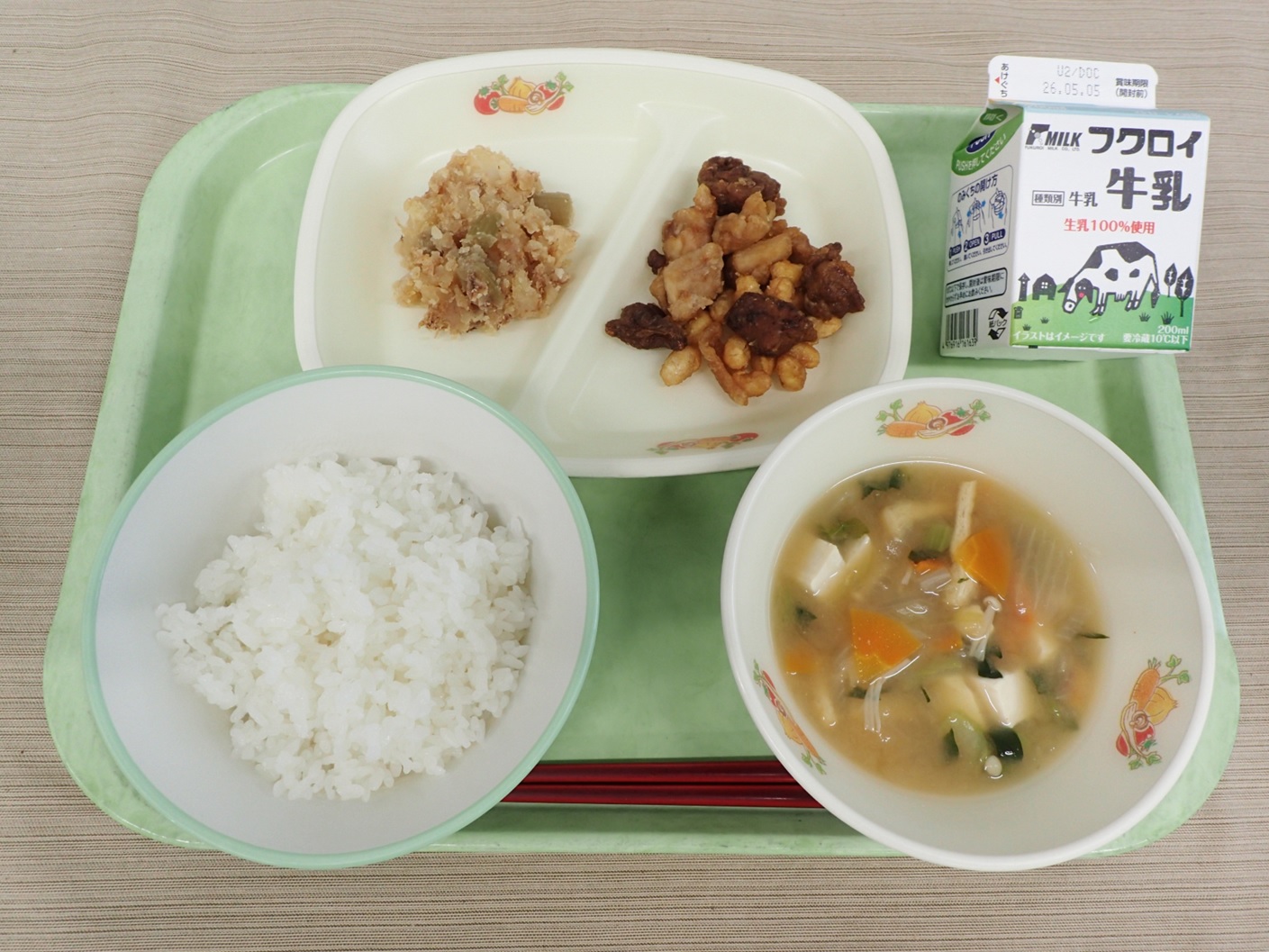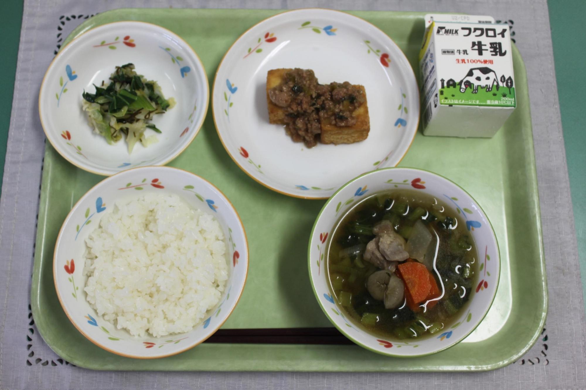 ごはん、ぎゅうにゅう、あつあげのにくみそがけ、