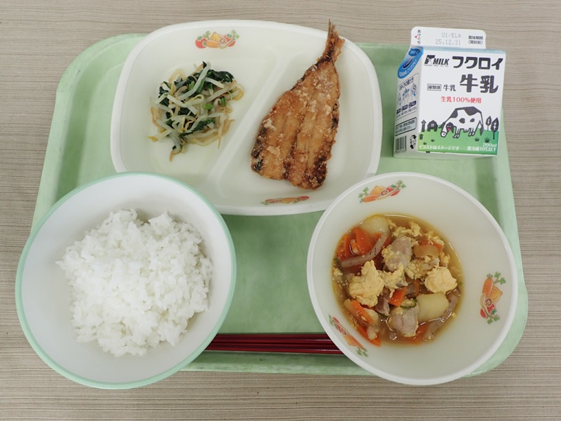 ごはん、ぎゅうにゅう、いわしのたつたあげ、