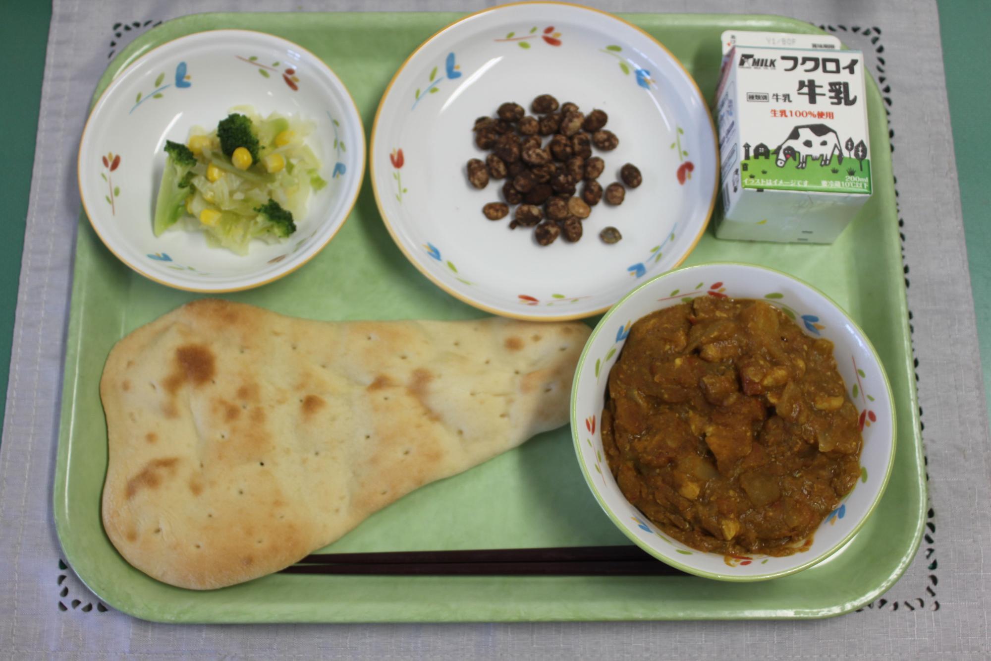 むぎごはん、ぎゅうにゅう、とりにくとカシューナッツのあまからあえ、