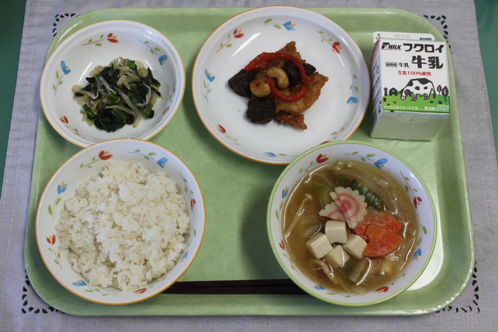 むぎごはん、ぎゅうにゅう、ふくろいポークのあまずあんかけ、