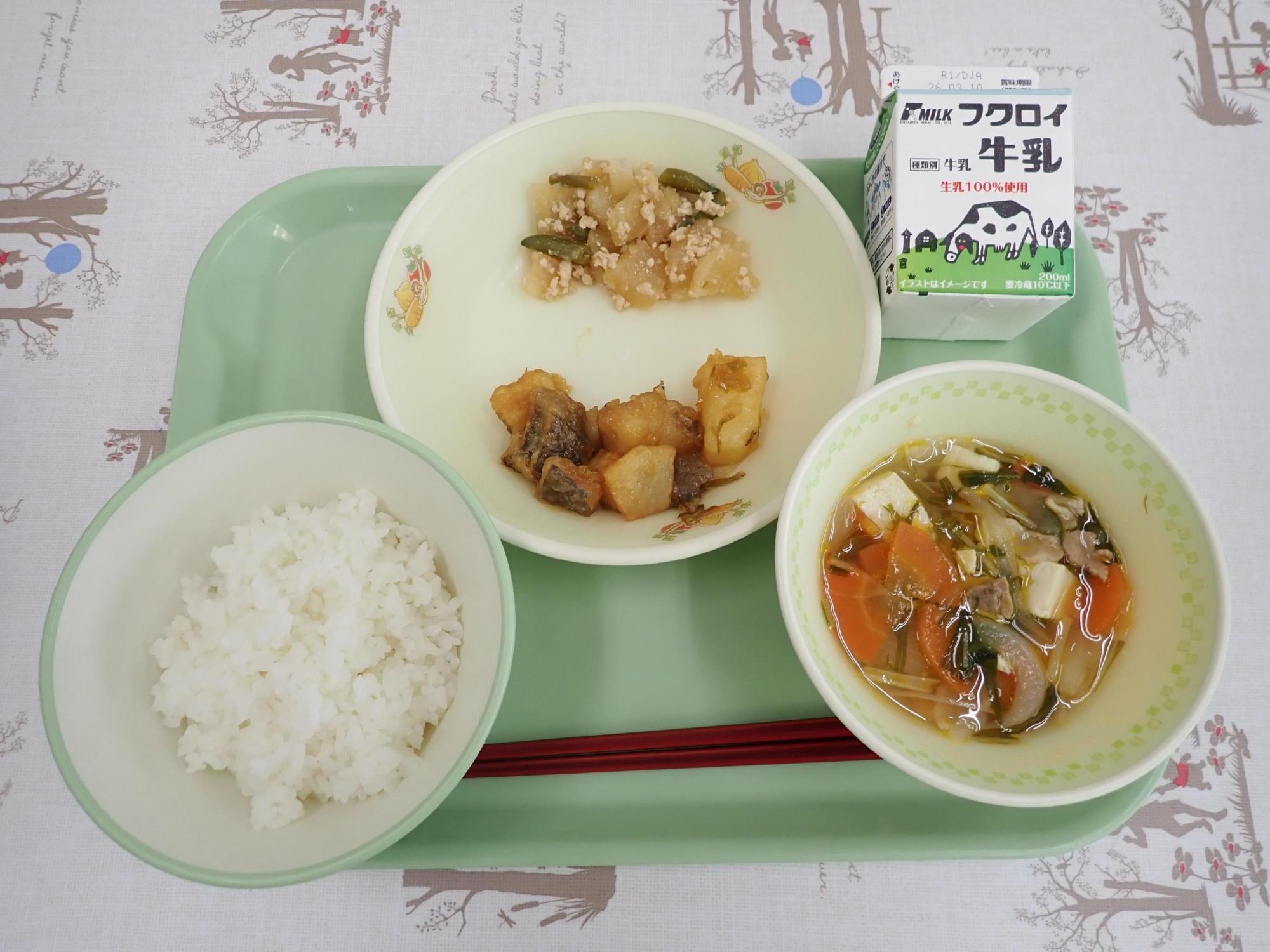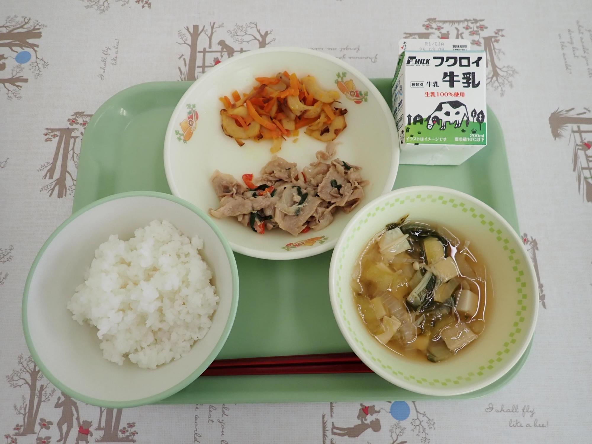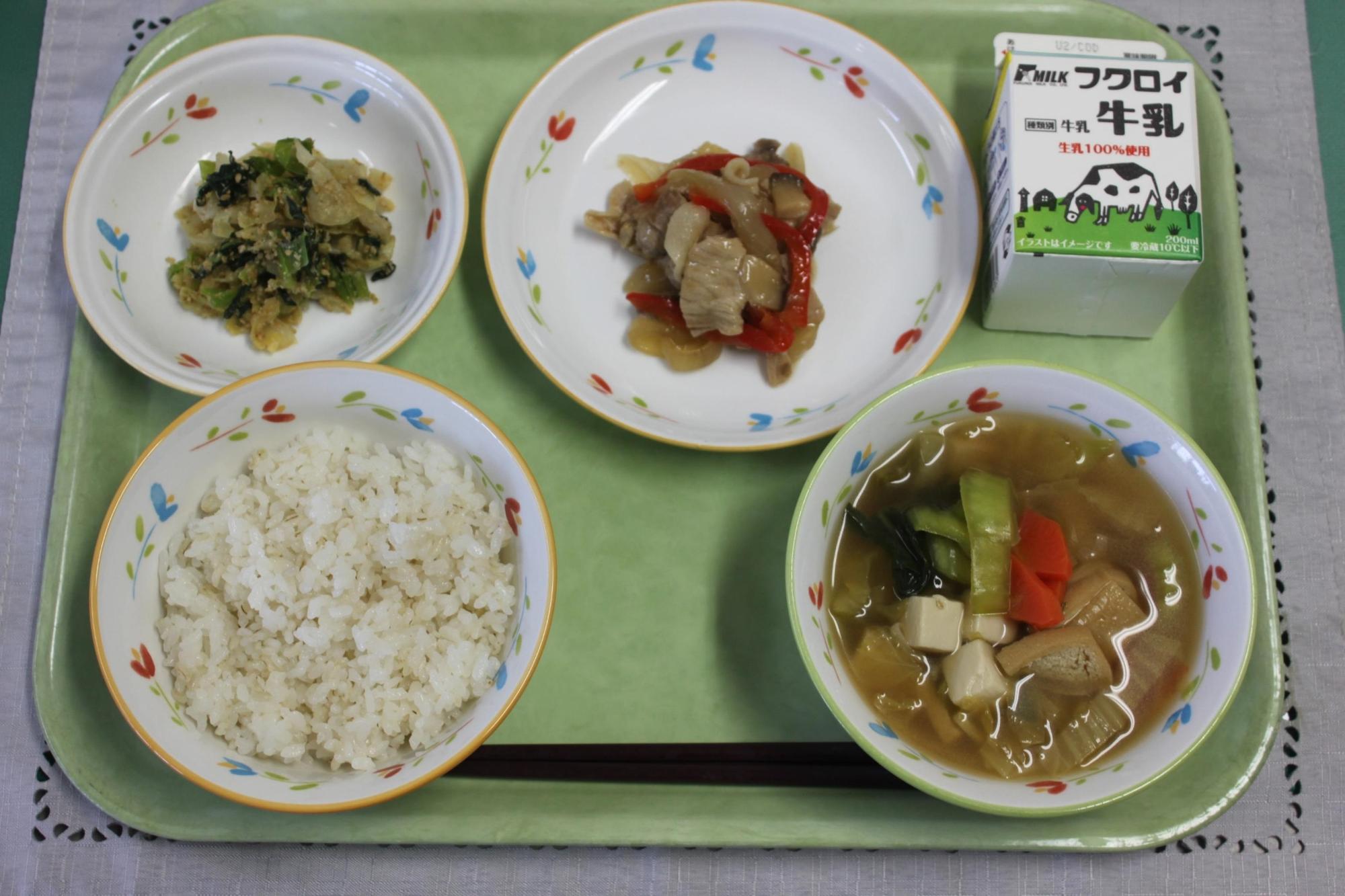 ごはん(アルファかまい)、ぎゅうにゅう、ぶたにくのみそいため、