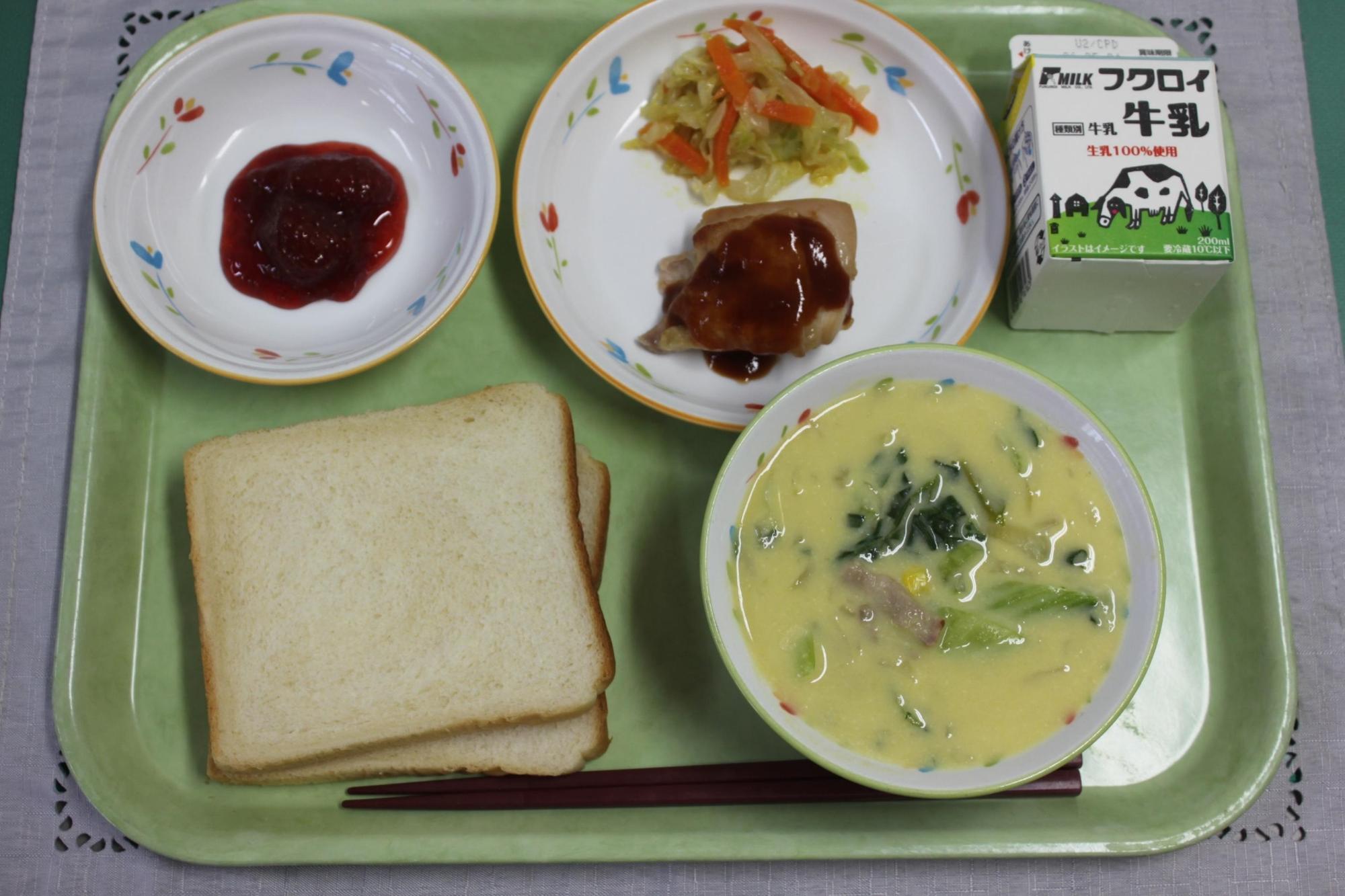 カレードレッシングサラダ、とうにゅうコーンチャウダー、てづくりいちごジャム
