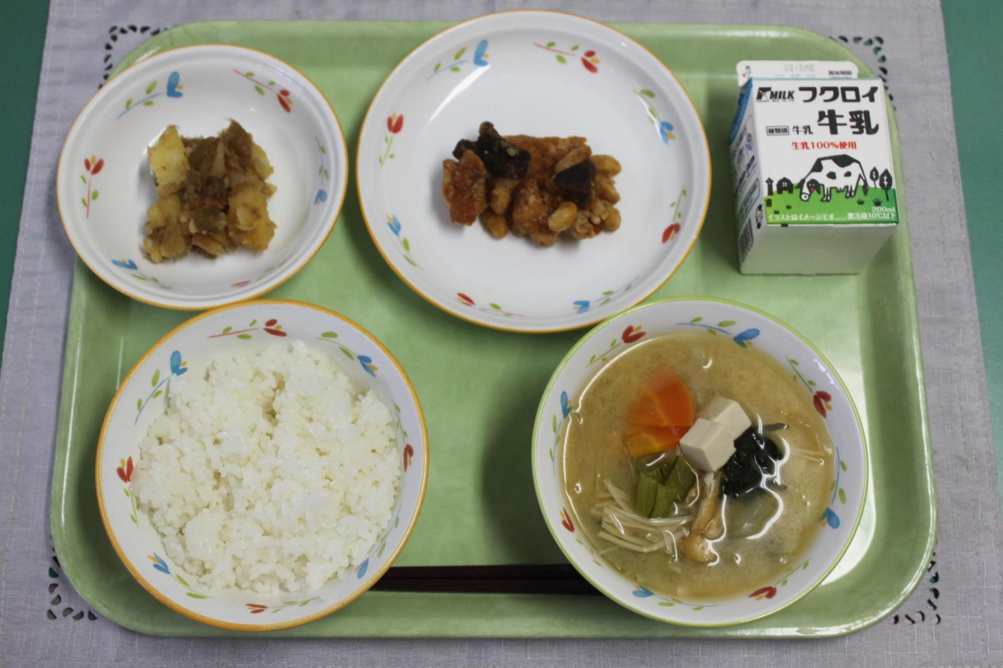 ごはん、ぎゅうにゅう、とりにくとレバーのあまからあげ、