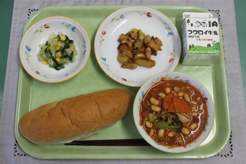 げんまいロールパン、ぎゅうにゅう、とりにくとだいずのトマトにこみ、
