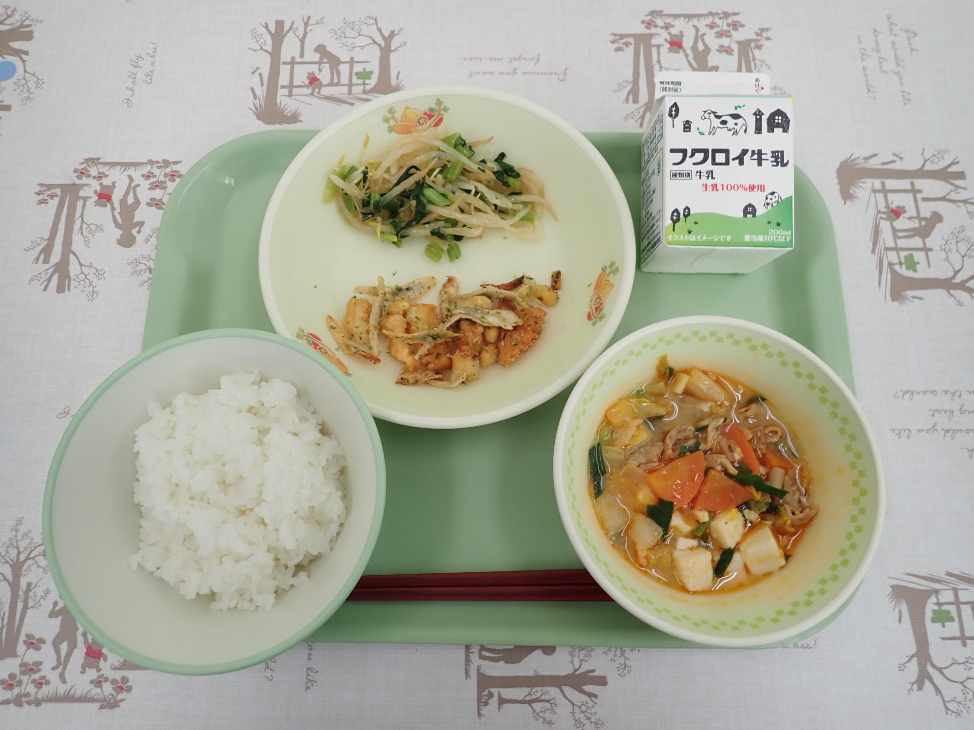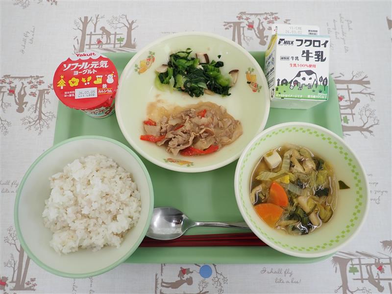チンゲンサイとしいたけのあえもの、ふくろいのおいしさいっぱいじる、ヨーグルト