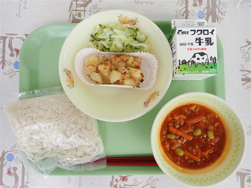 ソフトめん、ぎゅうにゅう、ミートソース、