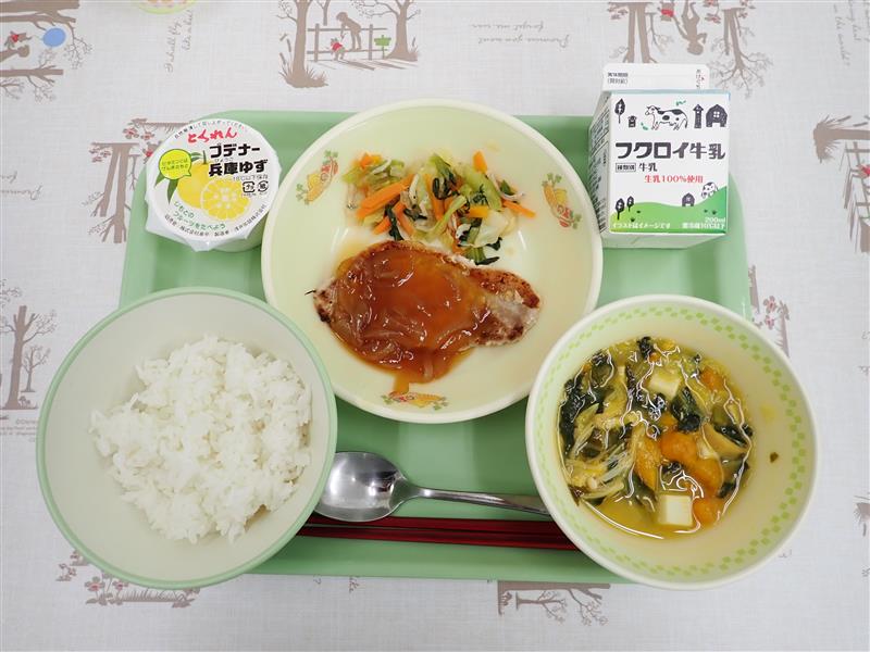 やさいとじゃこのいためもの、かぼちゃのみそしる、ゆずゼリー