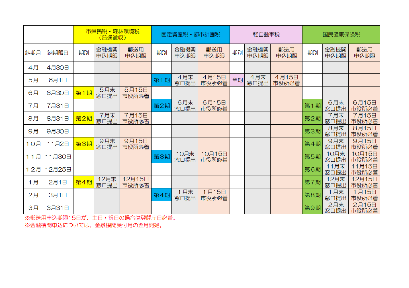 市県民税・森林環境税(普通徴収)、固定資産税・都市計画税、軽自動車税、国民健康保険税(普通徴収)