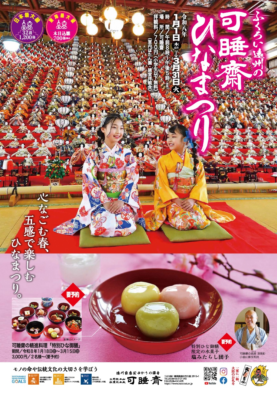 徳川家康公ゆかりの禅寺・可睡齋で、国登録有形文化財に登録された瑞龍閣(ずいりゅうかく)に、日本最大級のひな飾りが登場します。 同館1階では室内ぼたん園も開園し、期間中には山門前の階段に並ぶおひな様などの特別展示も行われます。